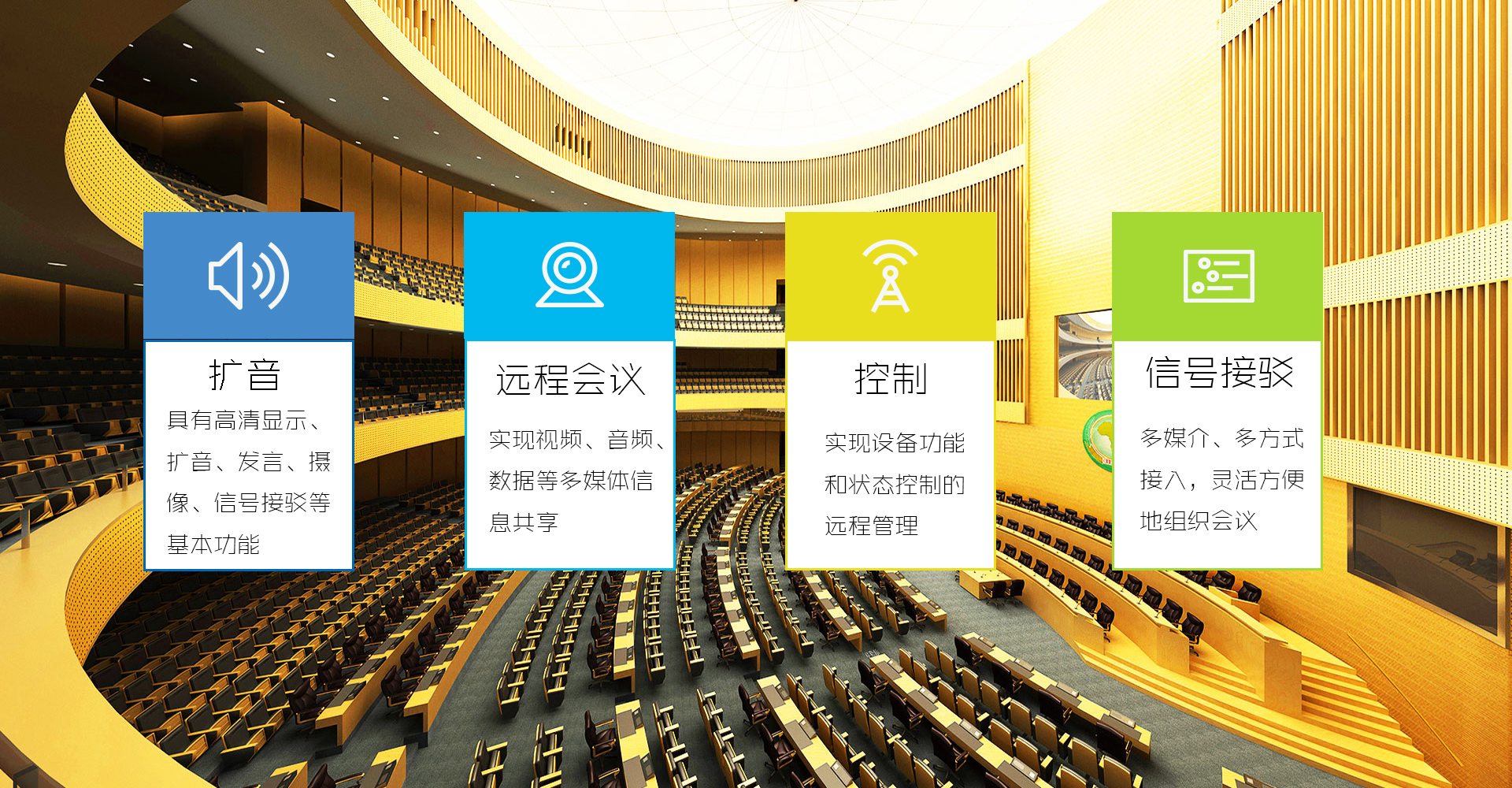 智能化會議系統(tǒng)具有高清顯示、擴(kuò)音、發(fā)言、攝像、信號接駁等基本功能,同時也應(yīng)具備智能化管理功能;實(shí)現(xiàn)視頻、音頻、數(shù)據(jù)等多媒體信息共享;實(shí)現(xiàn)設(shè)備控制和狀態(tài)的安全遠(yuǎn)程管理;具有會議預(yù)訂、變更、查詢、錄播、權(quán)限設(shè)置等會議管理功能;具有應(yīng)急響應(yīng)功能;可實(shí)現(xiàn)在會議中的無縫切換,保障會議平穩(wěn)進(jìn)行;多媒介,多方式接入,靈活方便地組織會議。